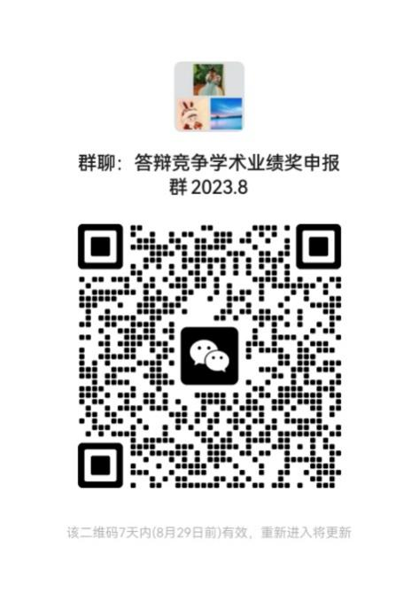 初评获奖候选人欲以答辩方式申报竞争上一等级奖学金的,即初评【二等奖/三等奖/未获奖】,申请以答辩形式竞争【一等奖/二等奖/三等奖】的,请于8月24日20点前扫码加入“答辩竞争学术业绩奖申报群2023.08”,初评候选人171-179(附件2)需通过答辩方式确定6个二等奖人选,也需扫码进群,不参加答辩的视为放弃竞争二等奖的机会。申请以答辩形式竞争一等奖的准备5分钟PPT,申请以答辩形式竞争二、三等奖的准备3分钟PPT,答辩时间另行通知,其余相关事宜微信群内通知。