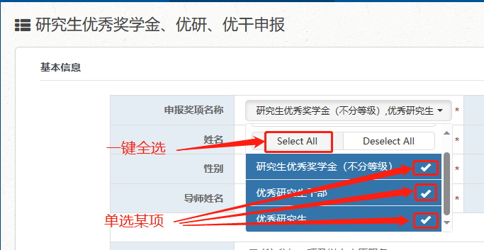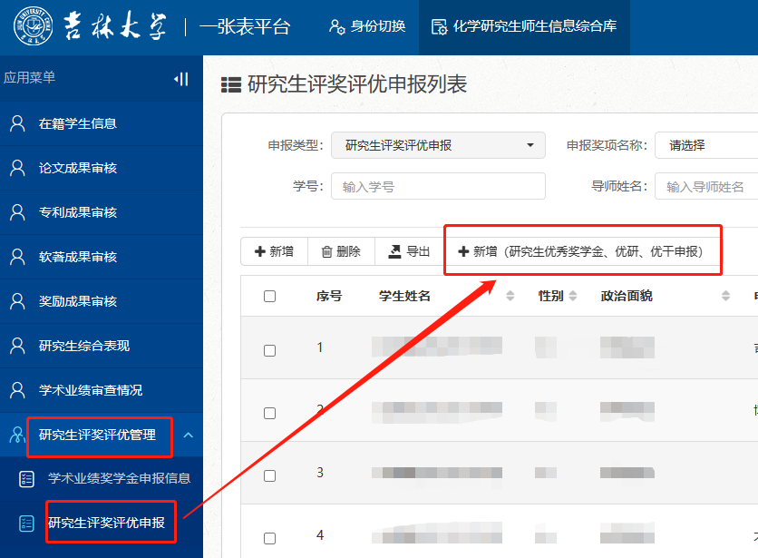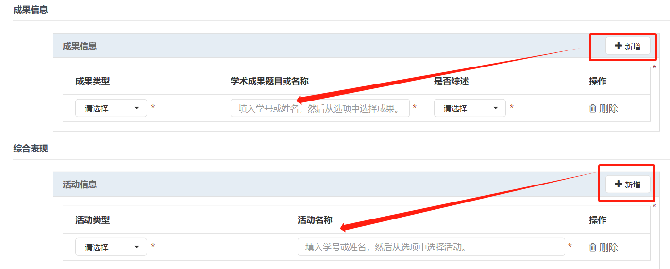 1、申报人请于10月13日8:00前使用个人邮箱账号登录“一张表”平台(//one.bkcomics.net),在“研究生评奖评优管理”-“研究生评奖评优申报”栏,点击【新增(研究生优秀奖学金、优研、优干申报)】进行信息填报,申报研究生优秀奖学金无需选择等级,依据综合得分由高到低自动定级;成果信息栏点击“新增”后输入“姓名或者学号”,然后从已审核通过的成果库中选择不超过3篇代表作参评;活动信息点击“新增”后输入“姓名或者学号”,然后从已审核通过的活动中选择上一学年参与的活动。