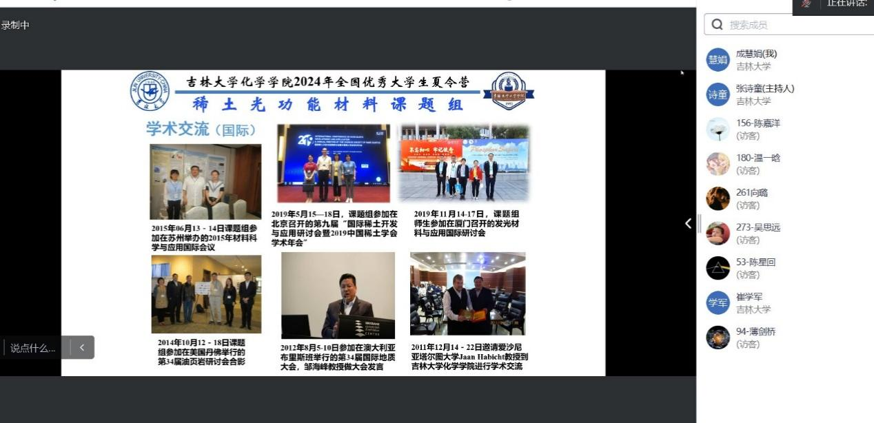 研究生导师组成的15个导师组以线下及线上会议的形式,通过ppt展讲、视频播放、自由讨论等多种形式与营员互动交流,使同学们进一步感受到了吉大化学雄厚的科研实力,营员们对心仪课题组的研究方向也有了更加深入的了解。