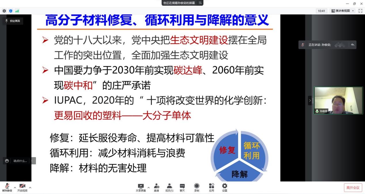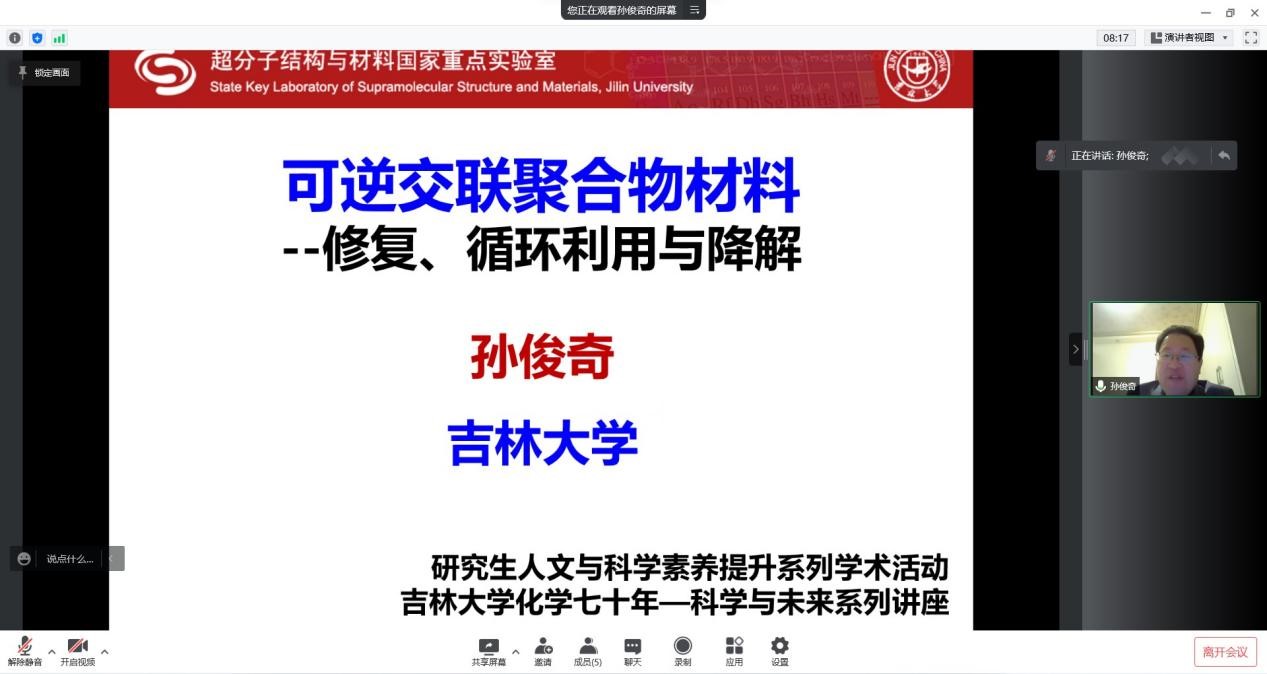 举办了“吉大化学70年院庆系列活动—科学与未来系列讲座”,本期讲座邀请了孙俊奇教授作主题为“可逆交联聚合物材料:修复、循环利用与降解”的线上学术报告。