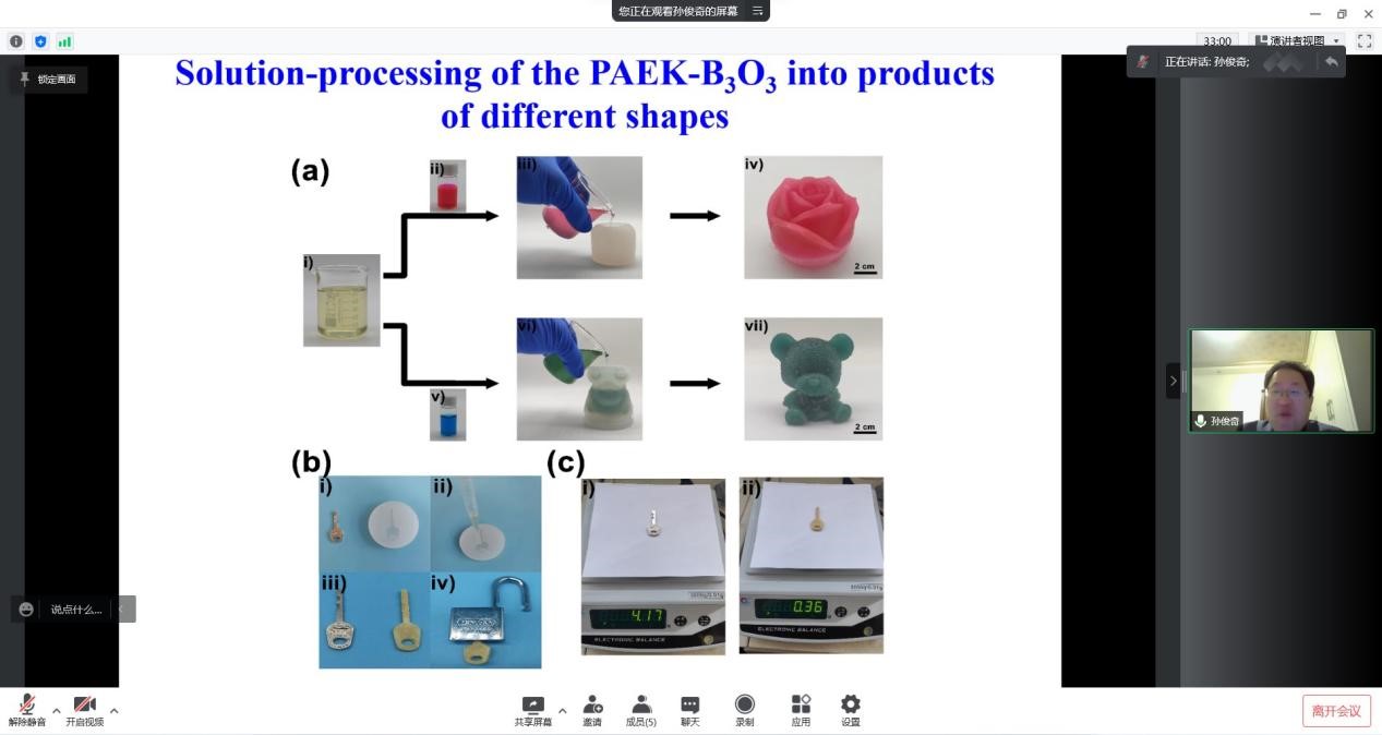 孙俊奇教授与同学们分享了可逆交联聚合物材料的研究进展及材料设计是简单和复杂的微妙平衡,团队的所有研究都面向实际应用出发,但却不止步于实际应用。这种永无止境的探索精神让人敬佩,这也是科研工作者在研究领域不断取得新突破的重要原因。