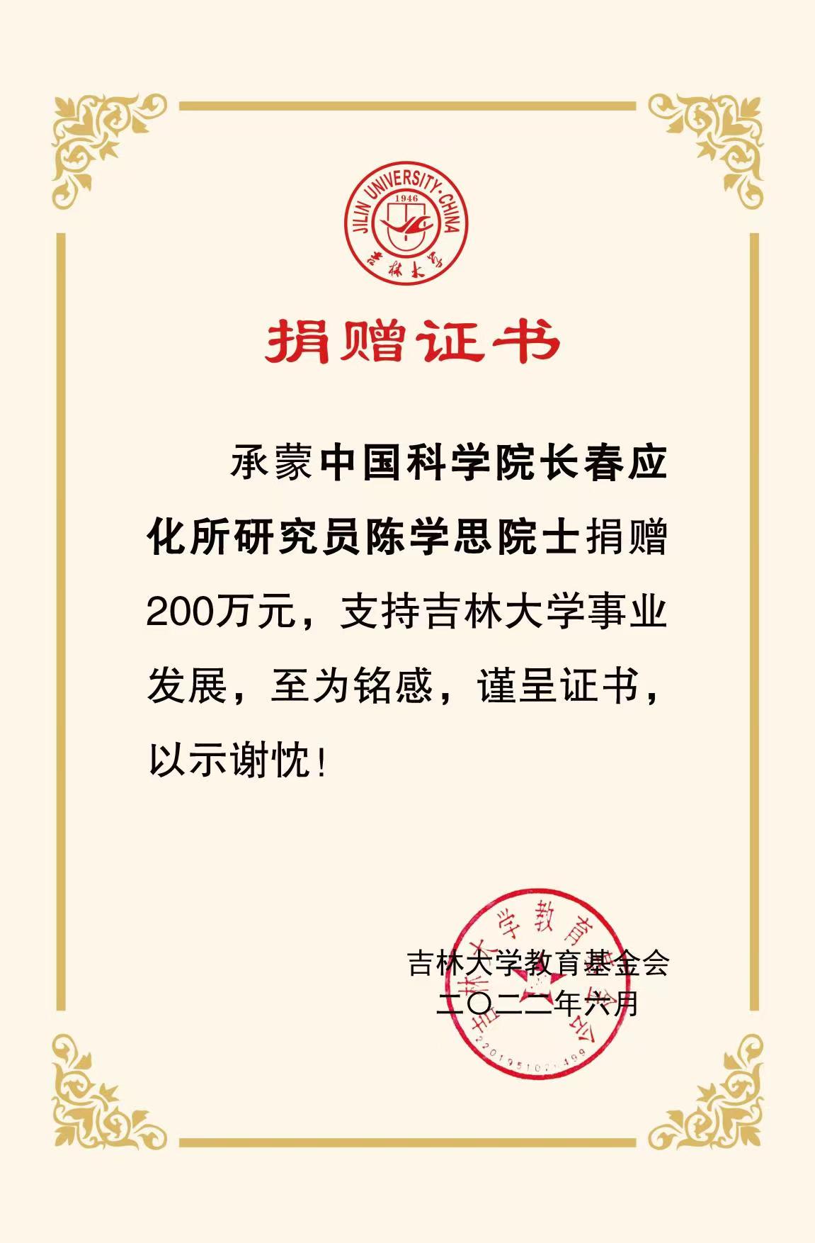 承蒙78级校友、中国科学院院士、中国科学院长春应用化学研究所陈学思研究员捐赠200万元,支持哔咔漫画 “关实之—陶慰孙奖学金”发展,至为铭感,谨呈证书,以示谢忱!