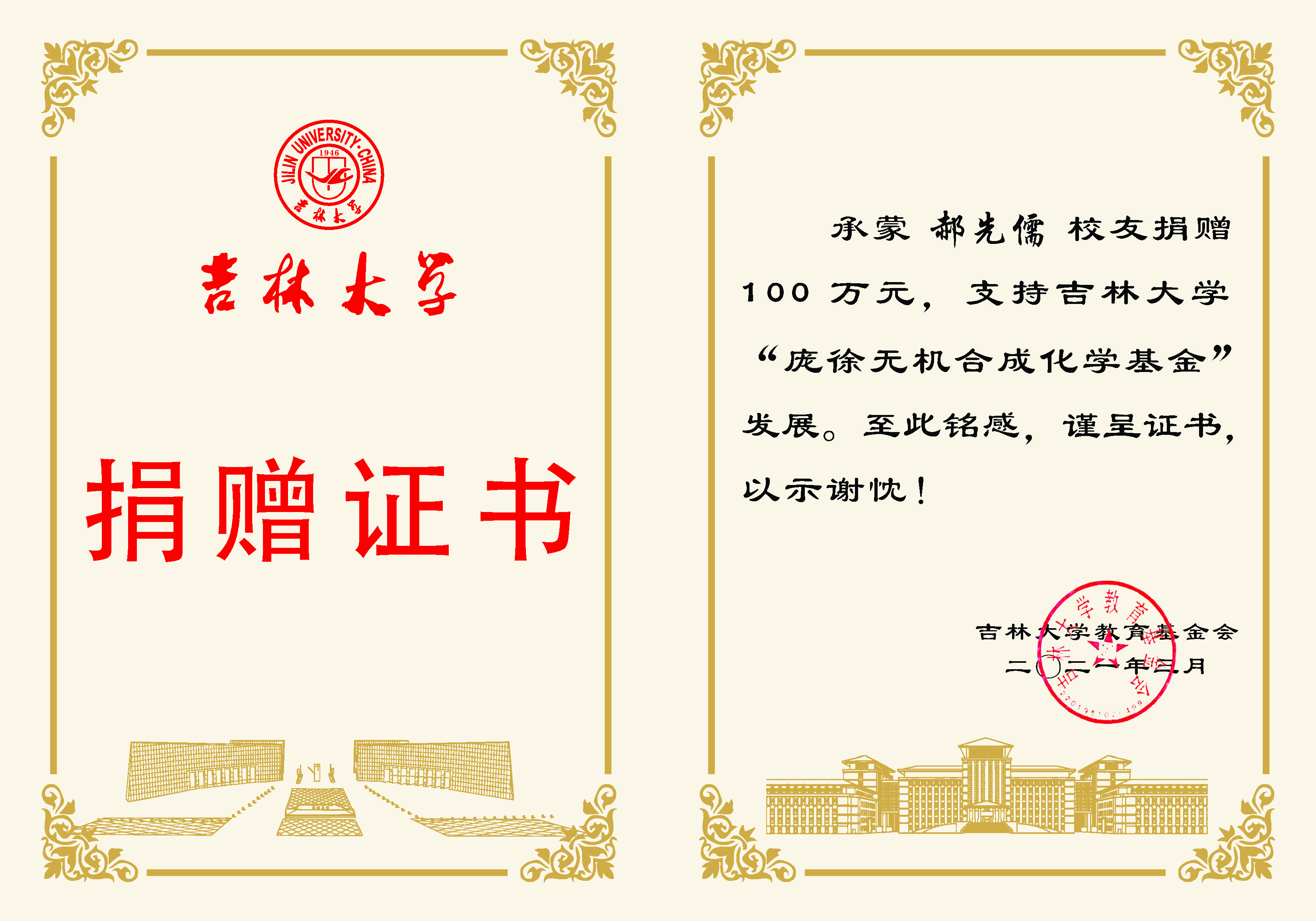 承蒙78级校友郝先儒先生捐赠100万元,支持哔咔漫画 “庞徐无机合成化学基金”发展,至为铭感,谨呈证书,以示谢忱!