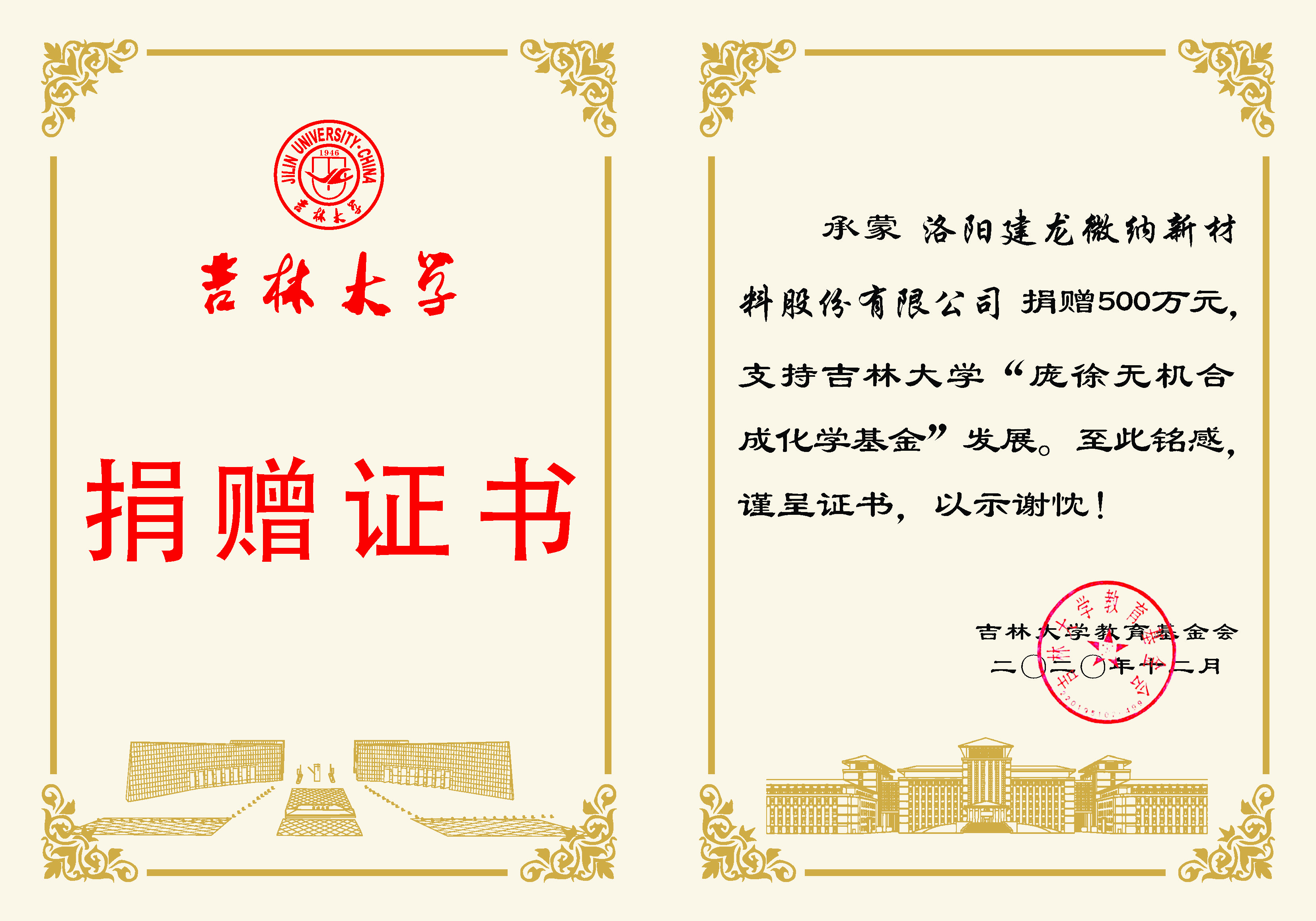 承蒙洛阳建龙微纳新材料股份有限公司捐赠500万元,支持哔咔漫画 “庞徐无机合成化学基金”发展,至为铭感,谨呈证书,以示谢忱!